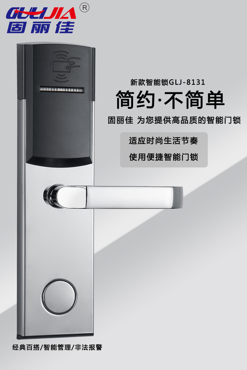 該款GLJ-8131不銹鋼酒店鎖,表面亮鉻處理,美觀耐用,永不褪色!有著經(jīng)典百搭、智能管理、智能防盜等多種特點。美麗的外觀及精美的設計讓您的酒店更加高大上,給客戶留下深刻印象。固麗佳酒店鎖防盜功能升級,安全,高檔,豪華,為您提供高品質(zhì)的智能門鎖!