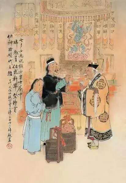 “拜織女”純是少女、少婦們的事。她們大都是預(yù)先和自己朋友或鄰里們約好五六人,多至十來人,聯(lián)合舉辦。舉行的儀式,是于月光下擺一張桌子,桌子上置茶、酒、水果、五子(桂圓、紅棗、榛子、花生,瓜子)等祭品;又有鮮花幾朵,束紅紙,插瓶子里,花前置一個(gè)小香爐。那么,約好參加拜織女的少婦、少女們,齋戒一天,沐浴停當(dāng),準(zhǔn)時(shí)都到主辦的家里來,于案前焚香禮拜后,大家一起圍坐在桌前,一面吃花生,瓜子,一面朝著織女星座,默念自己的心事。如少女們希望長得漂亮或嫁個(gè)如意郎、少婦們希望早生貴子等,都可以向織女星默禱。玩到半夜始散。